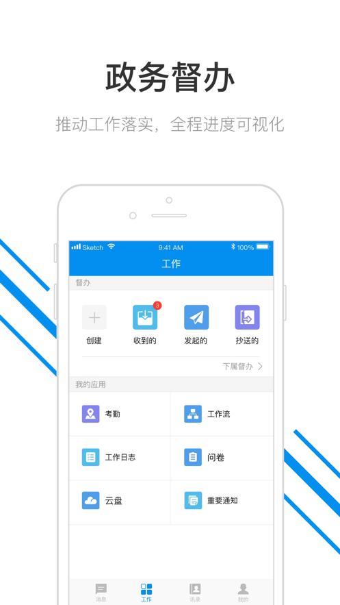 政务督办APP应用平台:项目档案、进度计划、授权访问、进度上报与督察、投资计划和实际投资、事件交办、事件回复等功能。
